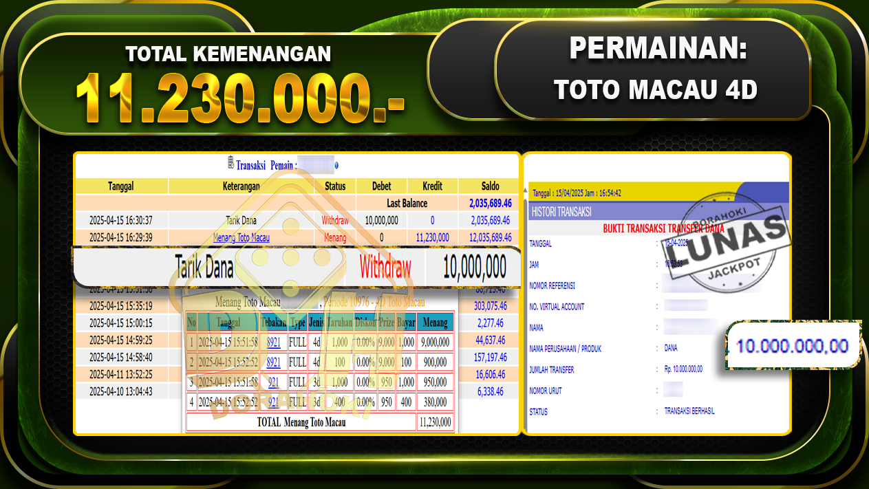 Bukti JP TOGEL TOTOMACAU 4D – ucapkan selamat kepada user id Kamxxx atas kemenangan di TOGEL TOTOMACAU 4D dengan total kemenangan Rp.11.230.000,- . Yang pasti nya langsung LUNAS sesuai bukti ya bosku. Dorahoki nih bosku berapapun akan tetap kami bayar lunas ya bosku.