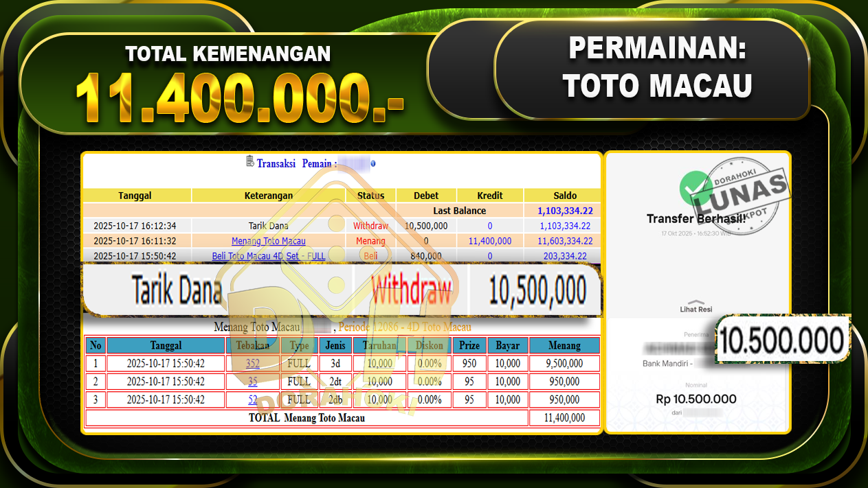 Bukti JP TOGEL TOTOMACAU 4D – ucapkan selamat kepada user id harxxx atas kemenangan di TOGEL TOTOMACAU 4D dengan total kemenangan Rp.11.400.000,- Yang pasti nya langsung LUNAS sesuai bukti ya bosku. Dorahoki nih bosku berapapun akan tetap kami bayar lunas ya bosku