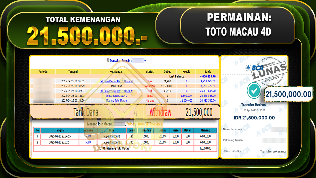Bukti JP TOGEL TOTOMACAU 4D – ucapkan selamat kepada user id Mimxxx atas kemenangan di TOGEL TOTOMACAU 4D dengan total kemenangan Rp.21.500.000,- . Yang pasti nya langsung LUNAS sesuai bukti ya bosku. Dorahoki nih bosku berapapun akan tetap kami bayar lunas ya bosku.