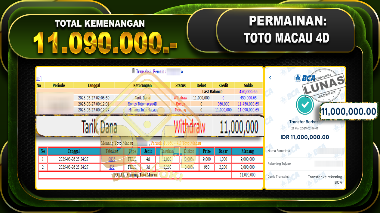 Bukti JP TOGEL TOTOMACAU 4D – ucapkan selamat kepada user id Sagxxx atas kemenangan di TOGEL TOTOMACAU 4D dengan total kemenangan Rp.11.090.000,- . Yang pasti nya langsung LUNAS sesuai bukti ya bosku. Dorahoki nih bosku berapapun akan tetap kami bayar lunas ya bosku.