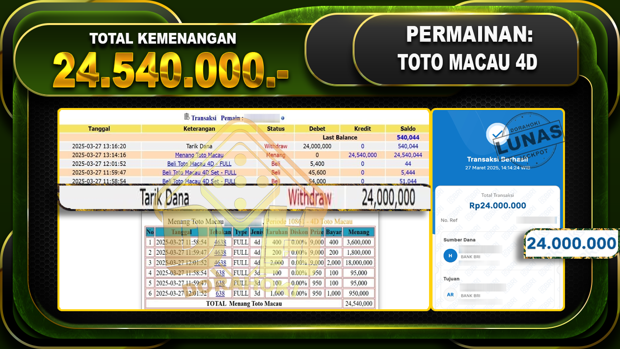 Bukti JP TOGEL TOTOMACAU 4D – ucapkan selamat kepada user id Aguxxx atas kemenangan di TOGEL TOTOMACAU 4D dengan total kemenangan Rp.24.540.000,- . Yang pasti nya langsung LUNAS sesuai bukti ya bosku. Dorahoki nih bosku berapapun akan tetap kami bayar lunas ya bosku.
