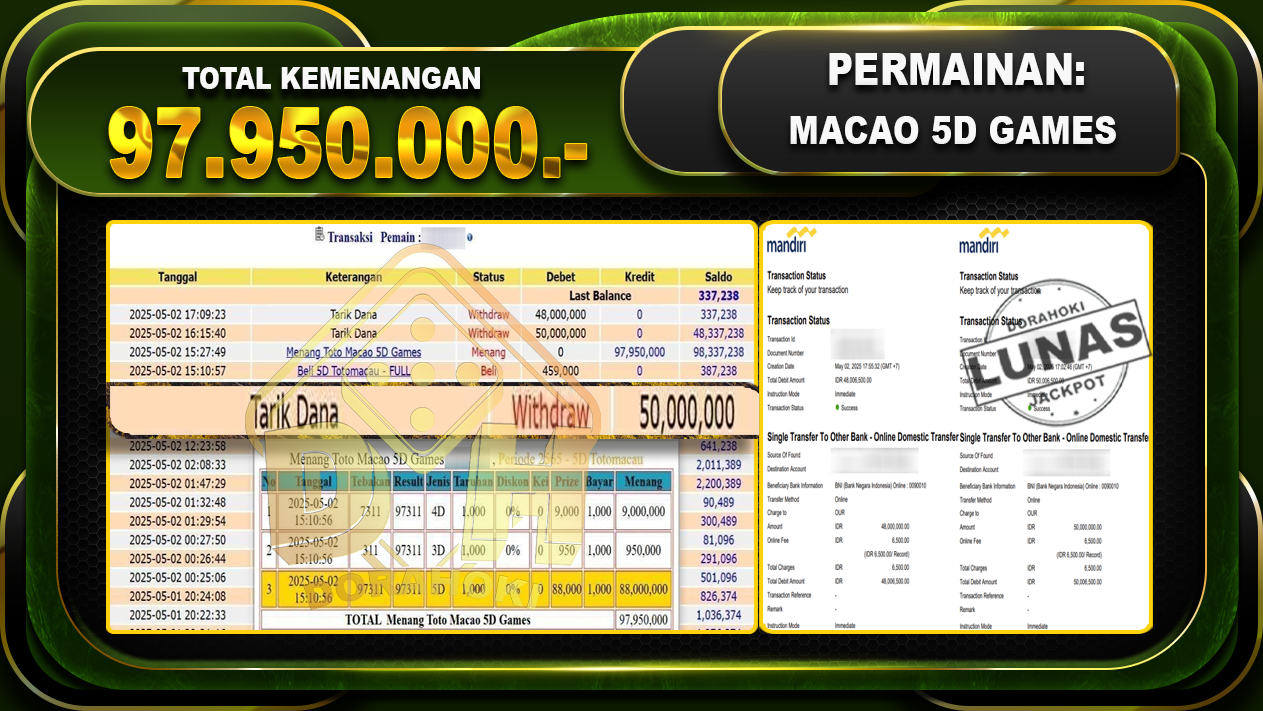 Bukti JP TOGEL TOTOMACAU 5D – ucapkan selamat kepada user id Jaixxx atas kemenangan di TOGEL TOTOMACAU 5D dengan total kemenangan Rp.97.950.000,- . Yang pasti nya langsung LUNAS sesuai bukti ya bosku. Dorahoki nih bosku berapapun akan tetap kami bayar lunas ya bosku.