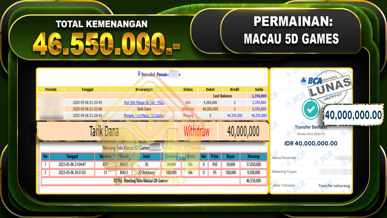 Bukti JP TOGEL TOTOMACAU 5D – ucapkan selamat kepada user id Busxxx atas kemenangan di TOGEL TOTOMACAU 5D dengan total kemenangan Rp.46.550.000,- . Yang pasti nya langsung LUNAS sesuai bukti ya bosku. Dorahoki nih bosku berapapun akan tetap kami bayar lunas ya bosku.