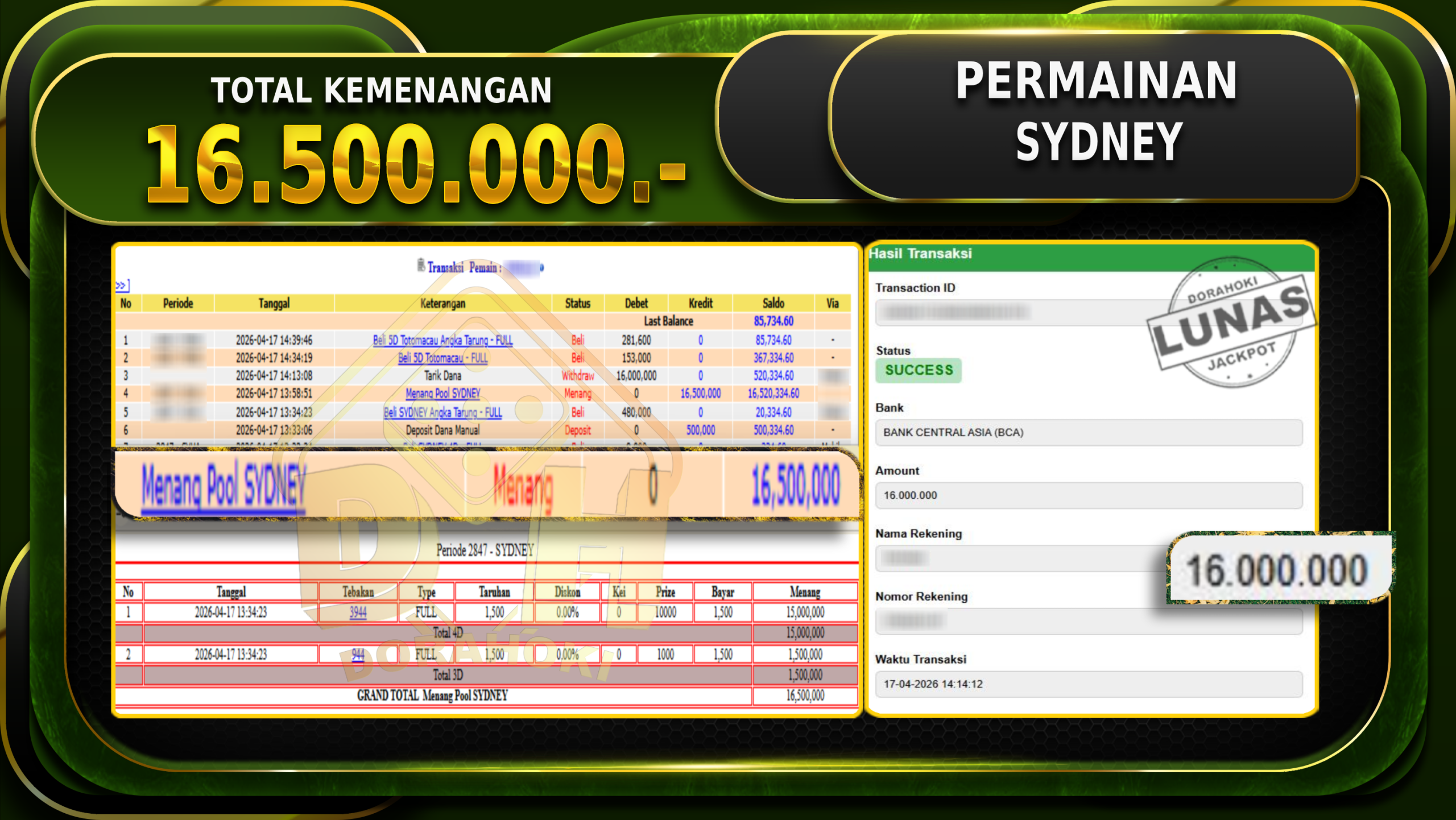 Bukti JP TOGEL TOTOMACAU – ucapkan selamat kepada user id Gacorxxx atas kemenangan di TOGEL TOTOMACAU dengan total kemenangan Rp.24.000.000,- . Yang pasti nya langsung LUNAS sesuai bukti ya bosku. Dorahoki nih bosku berapapun akan tetap kami bayar lunas ya bosku.
