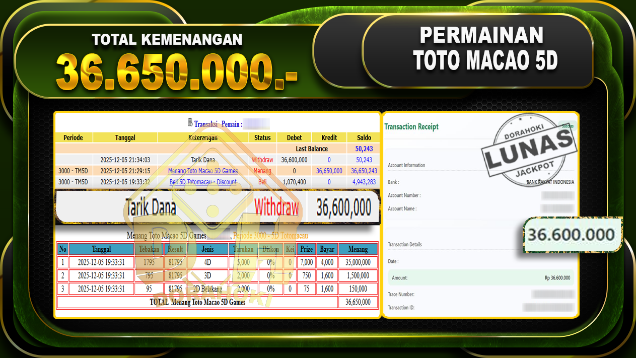 Bukti JP TOGEL Toto Macao 5D Games – ucapkan selamat kepada user id idoxxxx atas kemenangan di TOGEL Toto Macao 5D Games dengan total kemenangan Rp.36.650.000,- Yang pasti nya langsung LUNAS sesuai bukti ya bosku. Dorahoki nih bosku berapapun akan tetap kami bayar lunas ya bosku.