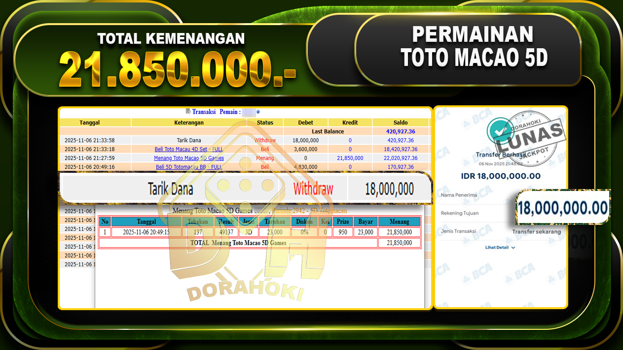 Bukti JP TOGEL Toto Macao 5D Games – ucapkan selamat kepada user id busxx atas kemenangan di TOGEL Toto Macao 5D Games dengan total kemenangan Rp.21.850.000,- Yang pasti nya langsung LUNAS sesuai bukti ya bosku. Dorahoki nih bosku berapapun akan tetap kami bayar lunas ya bosku.