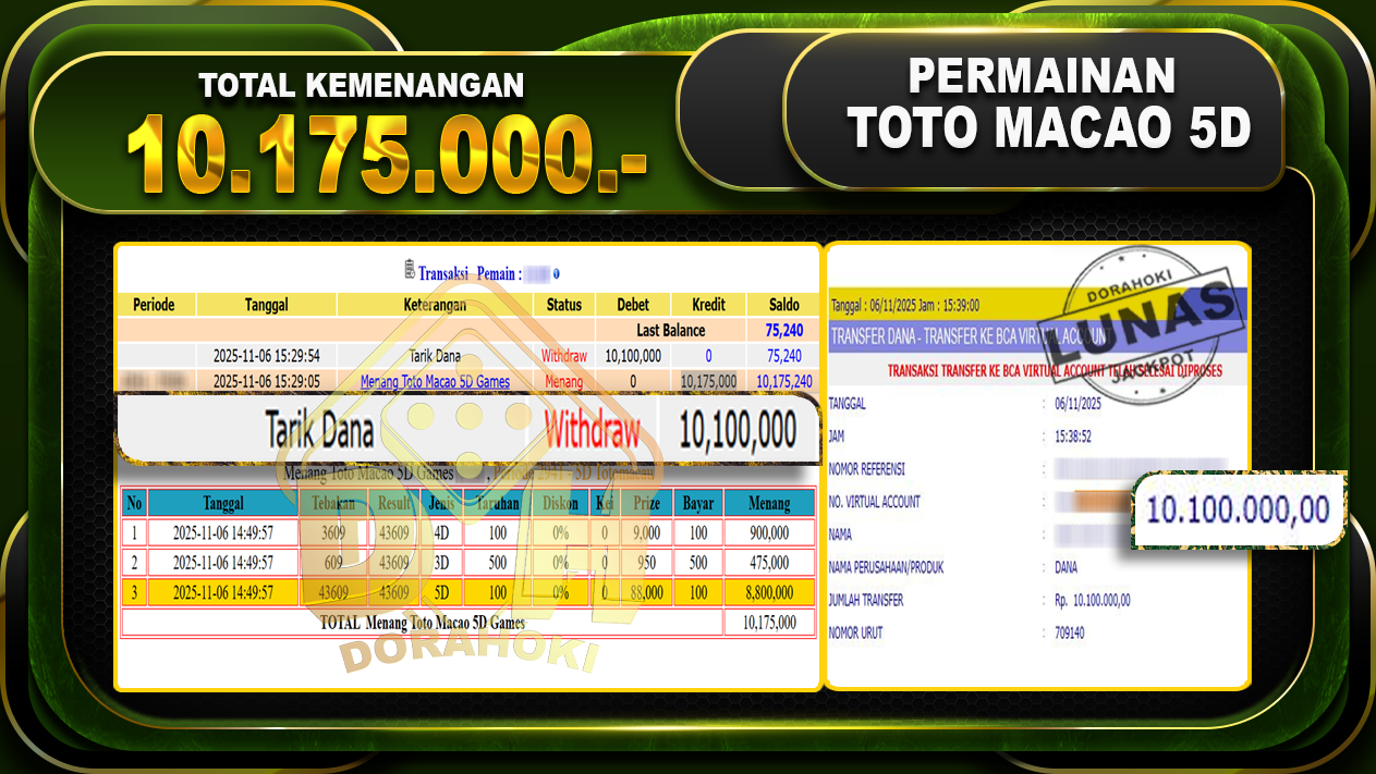 Bukti JP TOGEL Toto Macao 5D Games – ucapkan selamat kepada user id evoxx atas kemenangan di TOGEL Toto Macao 5D Games dengan total kemenangan Rp.10.175.000,- Yang pasti nya langsung LUNAS sesuai bukti ya bosku. Dorahoki nih bosku berapapun akan tetap kami bayar lunas ya bosku.