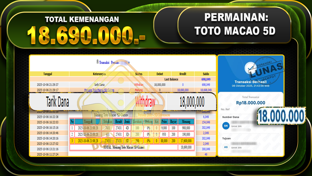 Bukti JP TOGEL Toto Macao 5D Games – ucapkan selamat kepada user id arvxxxx atas kemenangan di TOGEL Toto Macao 5D Games dengan total kemenangan Rp.18.690.000,- Yang pasti nya langsung LUNAS sesuai bukti ya bosku. Dorahoki nih bosku berapapun akan tetap kami bayar lunas ya bosku.