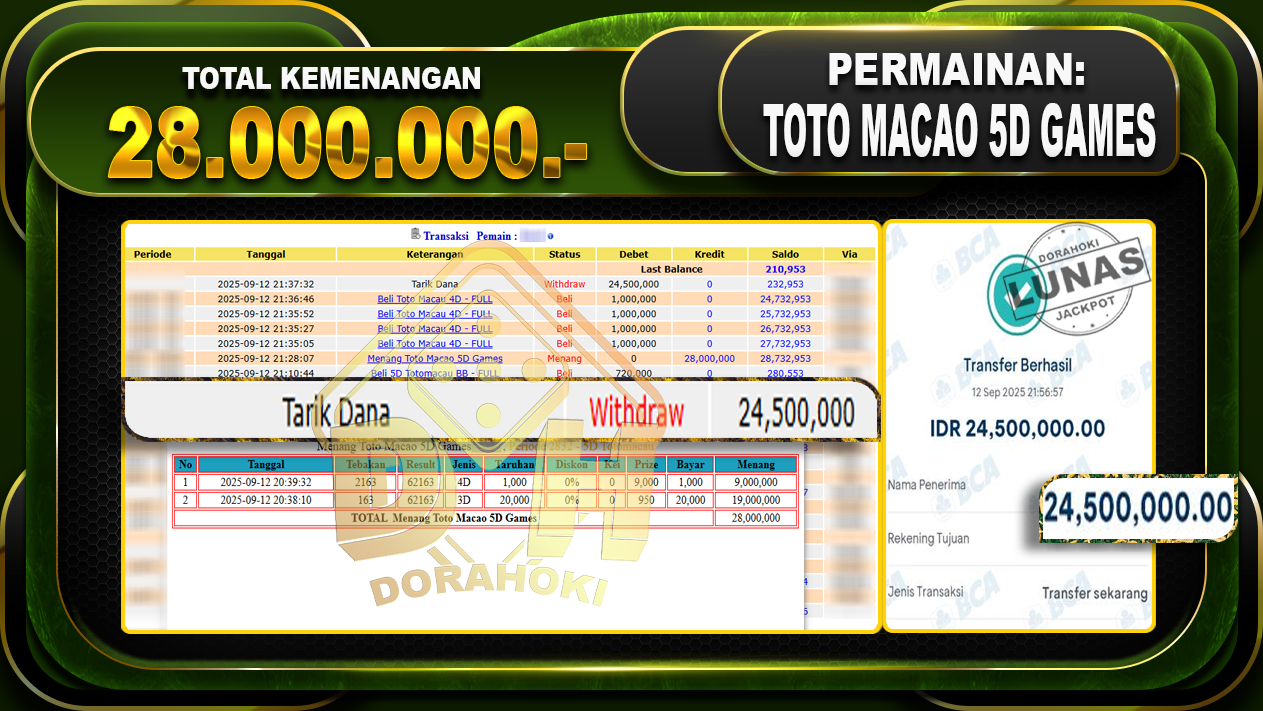 Bukti JP TOGEL Toto Macao 5D Games – ucapkan selamat kepada user id Busxxx atas kemenangan di TOGEL Toto Macao 5D Games dengan total kemenangan Rp.28.000.000,- Yang pasti nya langsung LUNAS sesuai bukti ya bosku. Dorahoki nih bosku berapapun akan tetap kami bayar lunas ya bosku.