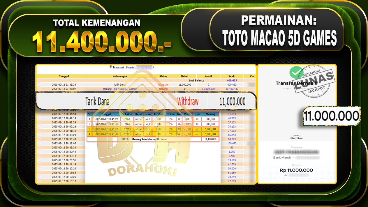 Bukti JP TOGEL Toto Macao 5D Games – ucapkan selamat kepada user id Dorxxxxxxx atas kemenangan di TOGEL Toto Macao 5D Games dengan total kemenangan Rp.11.400.000,- Yang pasti nya langsung LUNAS sesuai bukti ya bosku. Dorahoki nih bosku berapapun akan tetap kami bayar lunas ya bosku.