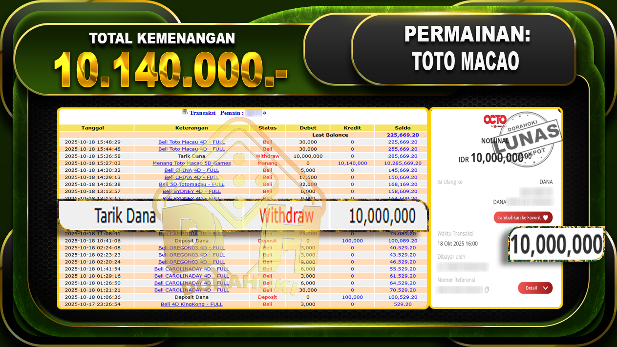 Bukti JP TOGEL Toto Macao 5D Games – ucapkan selamat kepada user id edxxx atas kemenangan di TOGEL Toto Macao 5D Games dengan total kemenangan Rp.10.140.000,- Yang pasti nya langsung LUNAS sesuai bukti ya bosku. Dorahoki nih bosku berapapun akan tetap kami bayar lunas ya bosku.
