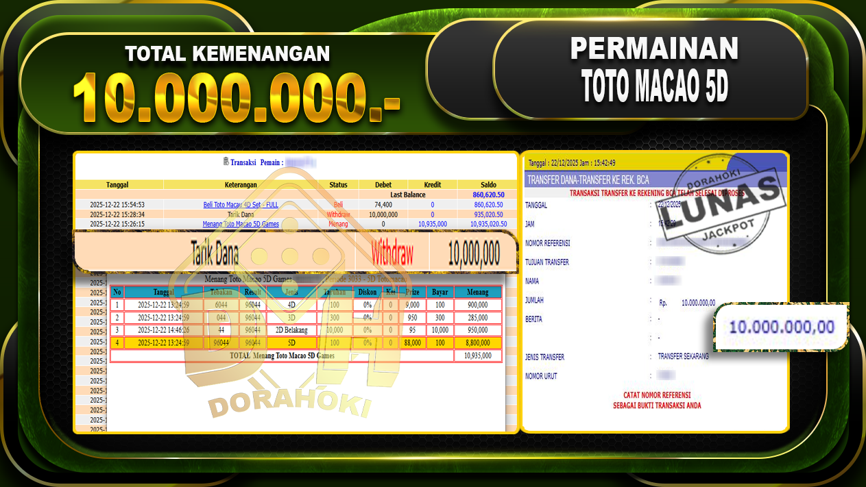 Bukti JP TOGEL Toto Macao 5D Games – ucapkan selamat kepada user id damxxxx atas kemenangan di TOGEL Toto Macao 5D Games dengan total kemenangan Rp.10.000.000,- Yang pasti nya langsung LUNAS sesuai bukti ya bosku. Dorahoki nih bosku berapapun akan tetap kami bayar lunas ya bosku.