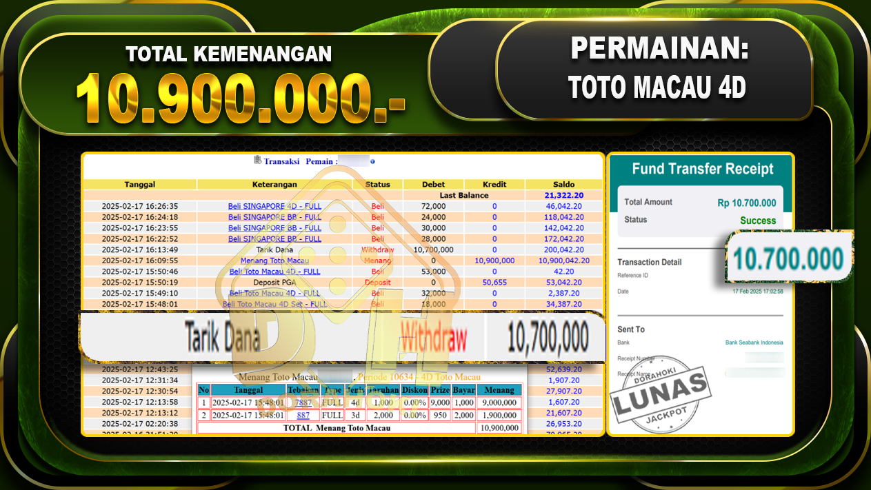 Bukti JP TOTO MACAU 4D – ucapkan selamat kepada user id Silfaxxx atas kemenangan di  TOTO MACAU 4D  dengan total kemenangan Rp.10.900.000,- . Yang pasti nya langsung LUNAS sesuai bukti ya bosku. Dorahoki nih bosku berapapun akan tetap kami bayar lunas ya bosku.