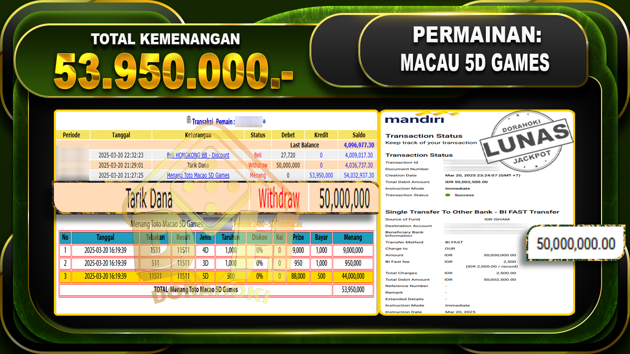 Bukti JP TOTO MACAU 5D – ucapkan selamat kepada user id Yonxxx atas kemenangan di TOTO MACAU 5D dengan total kemenangan Rp.53.950.000,- . Yang pasti nya langsung LUNAS sesuai bukti ya bosku. Dorahoki nih bosku berapapun akan tetap kami bayar lunas ya bosku.