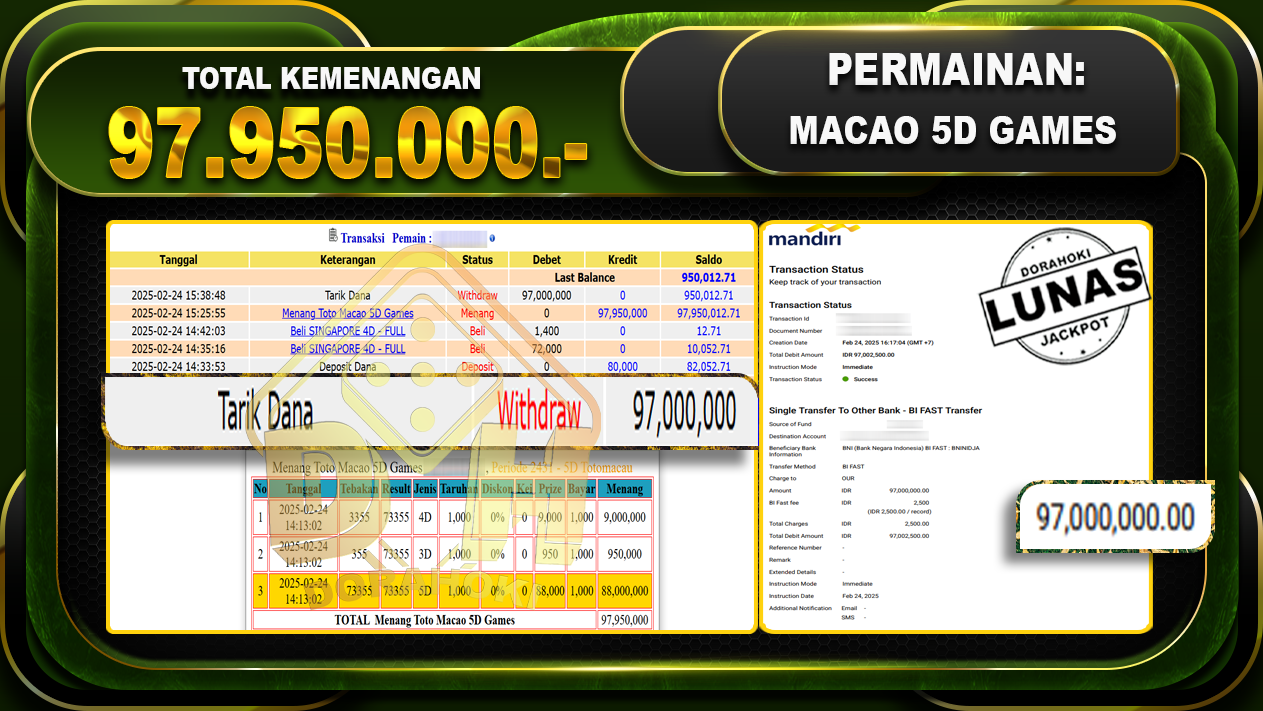 Bukti JP TOTO MACAU 5D – ucapkan selamat kepada user id gonsxxx atas kemenangan di  TOTO MACAU 5D  dengan total kemenangan Rp.97.950.000,- . Yang pasti nya langsung LUNAS sesuai bukti ya bosku. Dorahoki nih bosku berapapun akan tetap kami bayar lunas ya bosku.