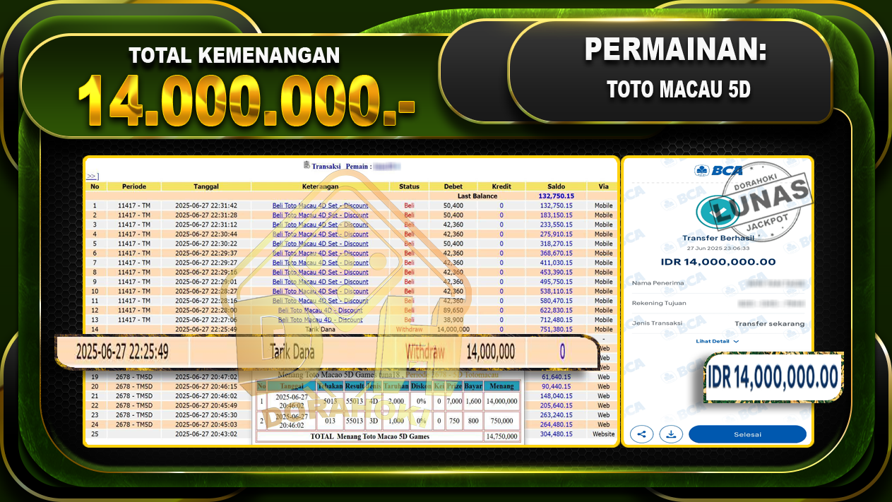 Bukti JP TOTO MACAU 5D – ucapkan selamat kepada user id TUNxxx atas kemenangan di TOTO MACAU 5D dengan total kemenangan Rp.14.000.000,- . Yang pasti nya langsung LUNAS sesuai bukti ya bosku. Dorahoki nih bosku berapapun akan tetap kami bayar lunas ya bosku.