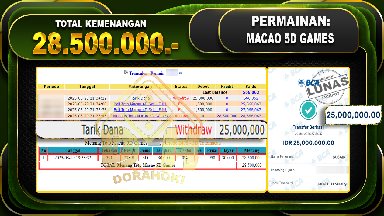 Bukti JP TOTO MACAU 5D – ucapkan selamat kepada user id Busxxx atas kemenangan di TOTO MACAU 5D dengan total kemenangan Rp.28.500.000,- . Yang pasti nya langsung LUNAS sesuai bukti ya bosku. Dorahoki nih bosku berapapun akan tetap kami bayar lunas ya bosku.