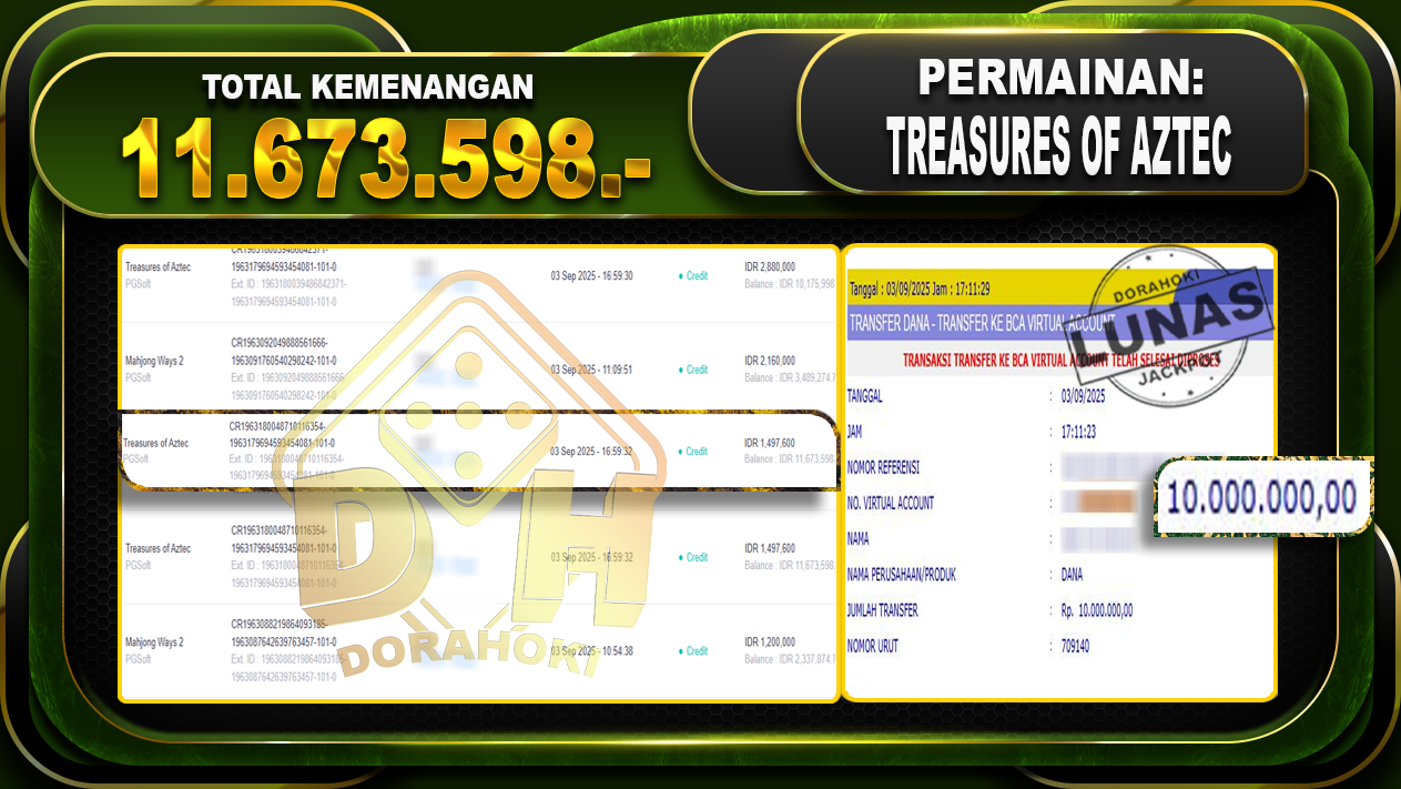 Bukti JP Treasures of Aztec- ucapkan selamat kepada user id Nidxxx atas kemenangan di Treasures of Aztec dengan total kemenangan Rp.11.673.598,- . Yang pasti nya langsung LUNAS sesuai bukti ya bosku. Dorahoki nih bosku berapapun akan tetap kami bayar lunas ya bosku.