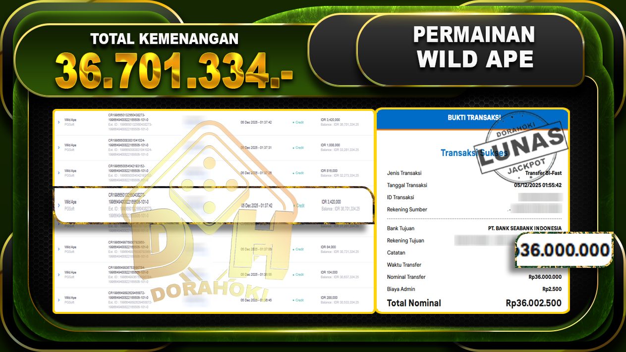 Bukti JP Wild Ape – ucapkan selamat kepada user id k0mxxxxx atas kemenangan di Wild Ape dengan total kemenangan Rp.36.701.334 – . Yang pasti nya langsung LUNAS sesuai bukti ya bosku. Dorahoki nih bosku berapapun akan tetap kami bayar lunas ya bosku.
