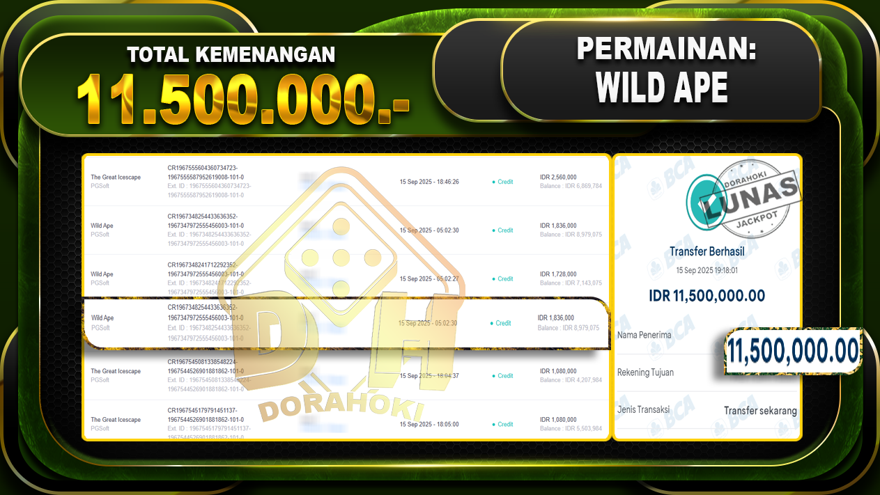 Bukti JP Wild Ape – ucapkan selamat kepada user id Derxxx atas kemenangan di Wild Ape dengan total kemenangan Rp.11.500.000 – . Yang pasti nya langsung LUNAS sesuai bukti ya bosku. Dorahoki nih bosku berapapun akan tetap kami bayar lunas ya bosku.