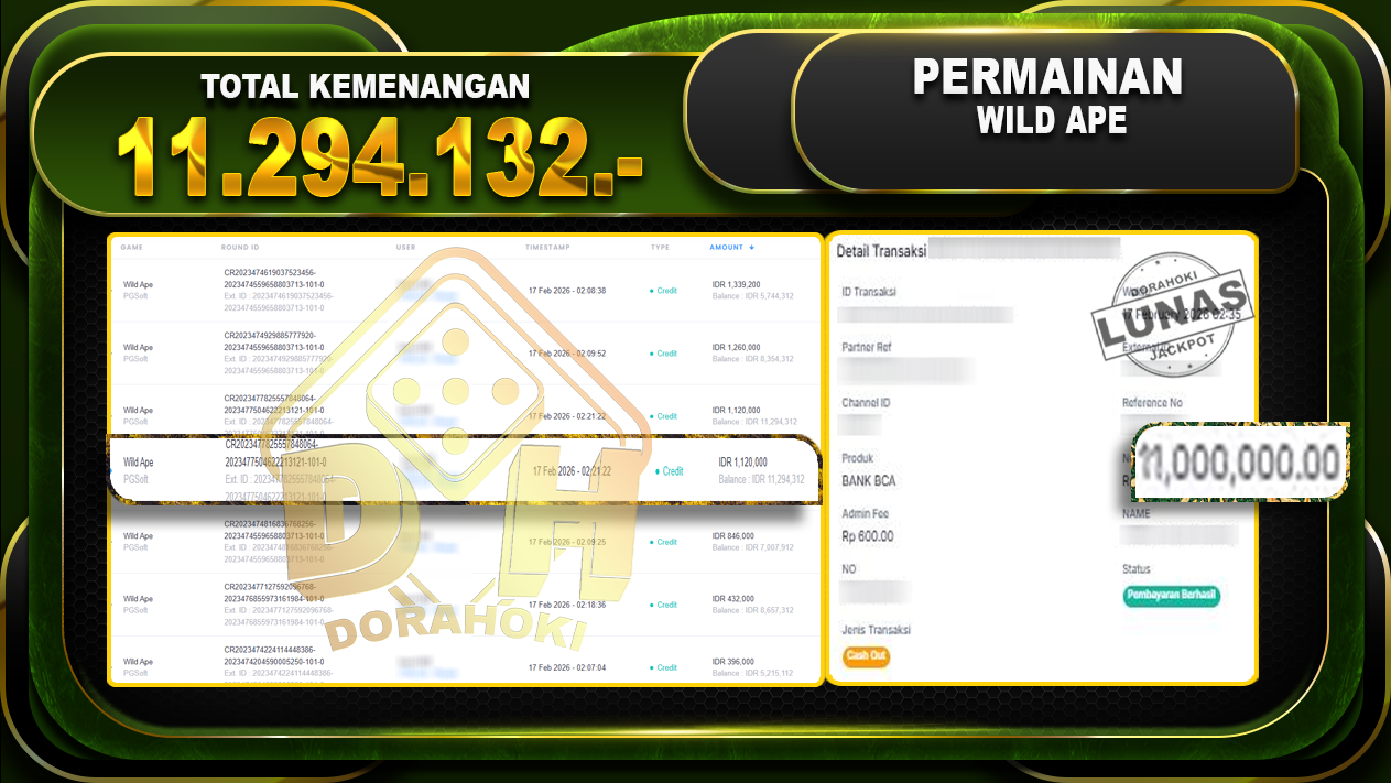 Bukti JP Wild Ape – ucapkan selamat kepada user id Bosxxxx atas kemenangan di Wild Ape dengan total kemenangan Rp.11.294.132.-. Yang pasti nya langsung LUNAS sesuai bukti ya bosku.Kemenangan Berapapun Situs DoraHoki Akan Membayar Lunas yah