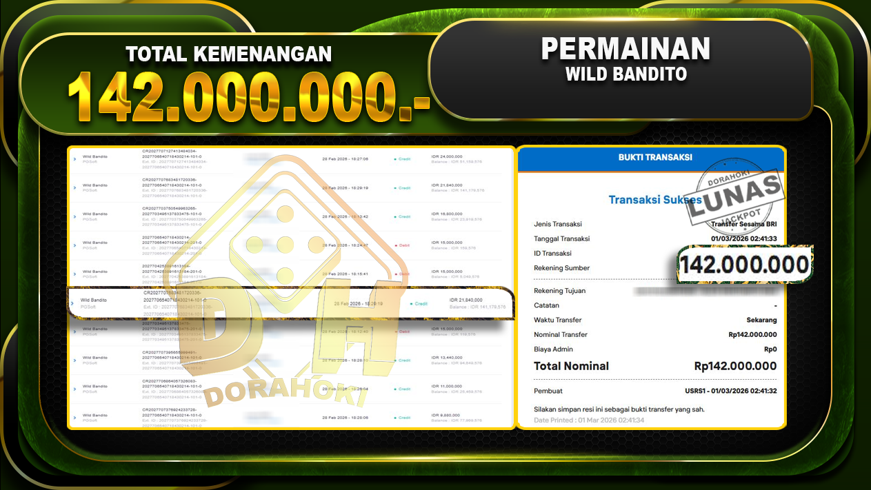 Bukti JP Wild Bandito- ucapkan selamat kepada user id Avaxxxx atas kemenangan di Wild Bandito dengan total kemenangan Rp.142.000.000.-. Yang pasti nya langsung LUNAS sesuai bukti ya bosku.Kemenangan Berapapun Situs DoraHoki Akan Membayar Lunas yah