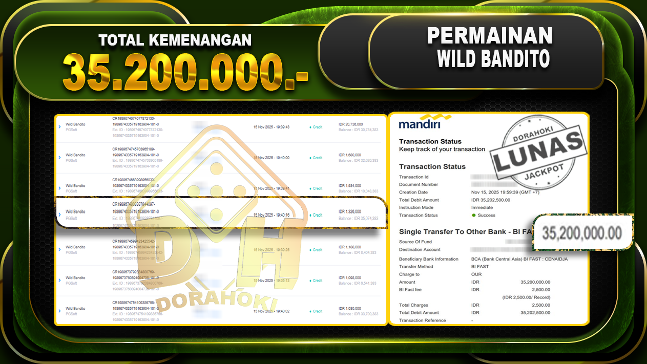 Bukti JP Wild Bandito – ucapkan selamat kepada user id rutxxxx atas kemenangan di Wild Bandito dengan total kemenangan Rp.35.200.000.-  Yang pasti nya langsung LUNAS sesuai bukti ya bosku. Dorahoki nih bosku berapapun akan tetap kami bayar lunas ya bosku.