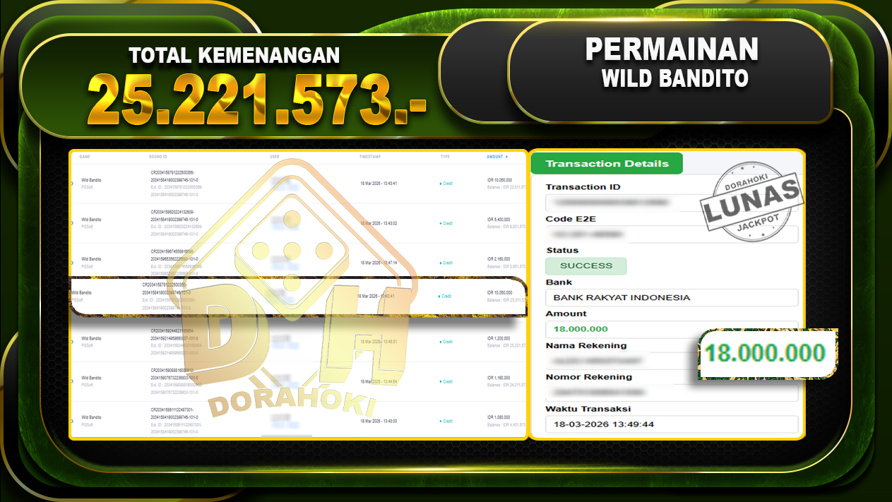 Bukti JP Wild Bandito- ucapkan selamat kepada user id Avaxxxx atas kemenangan di Wild Bandito dengan total kemenangan Rp.25.221.573.-. Yang pasti nya langsung LUNAS sesuai bukti ya bosku.Kemenangan Berapapun Situs DoraHoki Akan Membayar Lunas ya