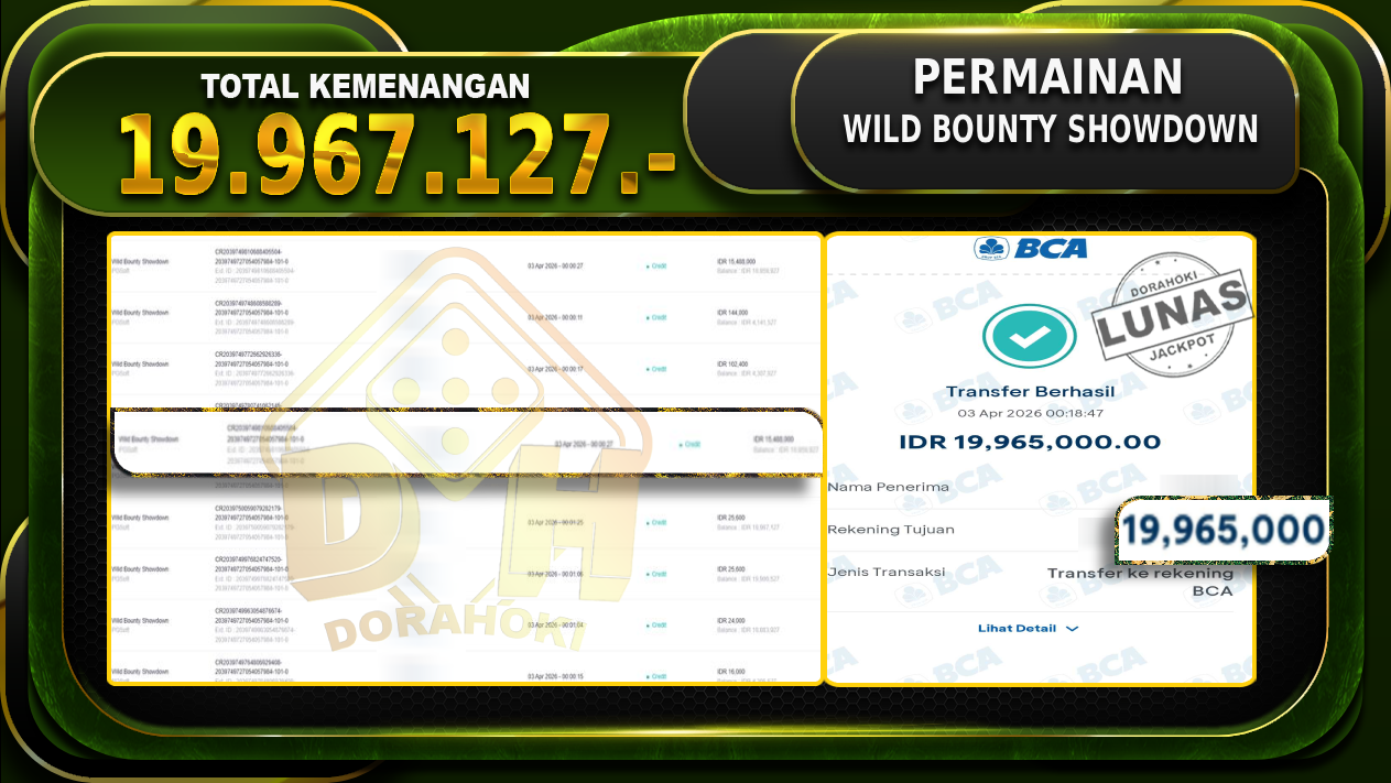 Bukti JP Wild Bounty Showdown – Selamat Kepada User id Husxxx atas kemenangan Wild Bounty Showdown Dengan Nominal Sebesar Rp.19.967.127,- Yang pasti nya langsung LUNAS Sesuai Bukti.