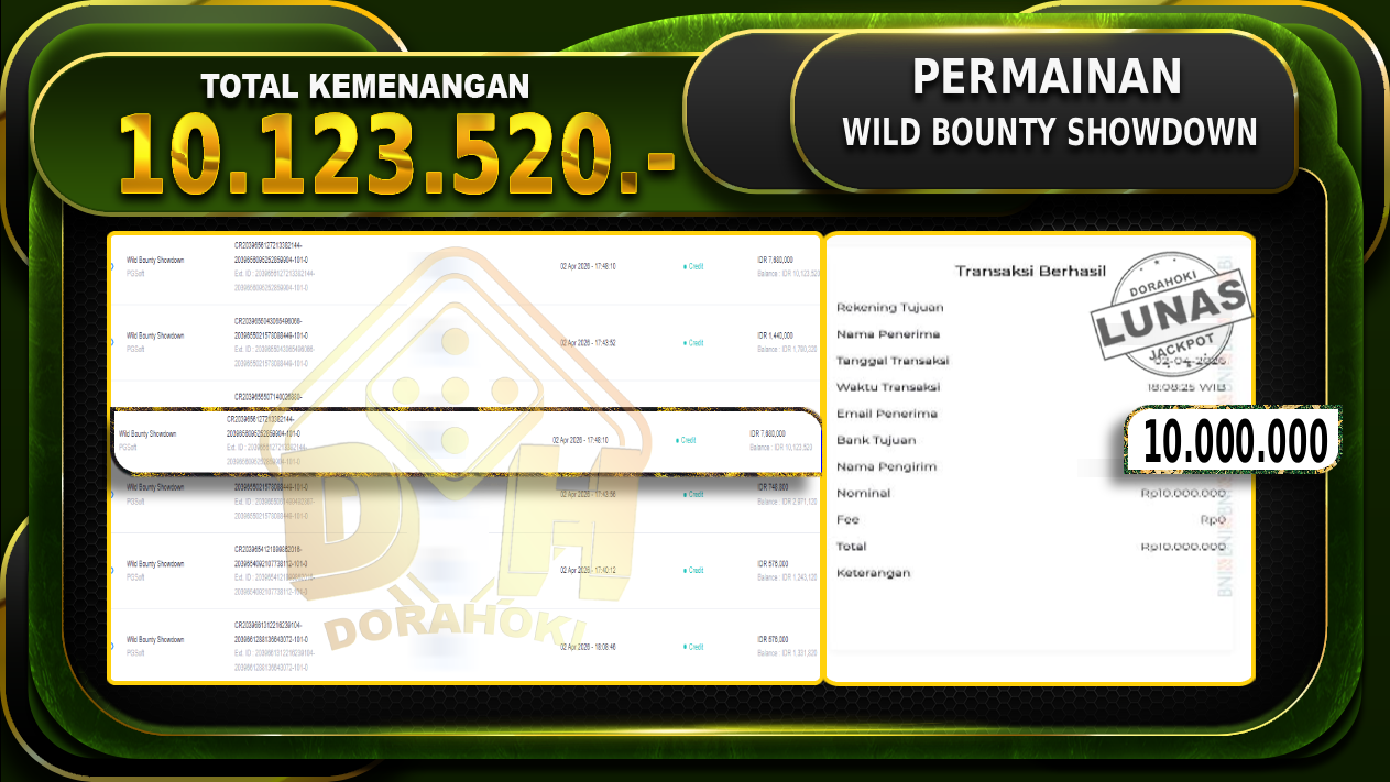 Bukti JP Wild Bounty Showdown – Selamat Kepada User id Blaxxx atas kemenangan Wild Bounty Showdown Dengan Nominal Sebesar Rp.10.123.520,- Yang pasti nya langsung LUNAS Sesuai Bukti.