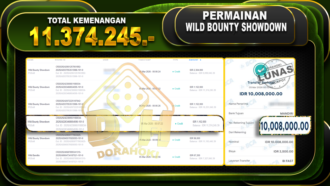Bukti JP Wild Bounty Showdown – Selamat Kepada User id Dorxxx atas kemenangan Wild Bounty Showdown Dengan Nominal Sebesar Rp.11.374.245,- Yang pasti nya langsung LUNAS Sesuai Bukti.