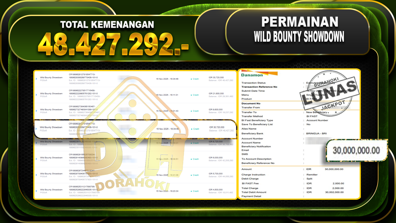 Bukti JP Wild Bounty Showdown – ucapkan selamat kepada user id setxxxxx atas kemenangan di  Wild Bounty Showdown dengan total kemenangan Rp.48.427.292,- Yang pasti nya langsung LUNAS sesuai bukti ya bosku. Dorahoki nih bosku berapapun akan tetap kami bayar lunas ya bosku