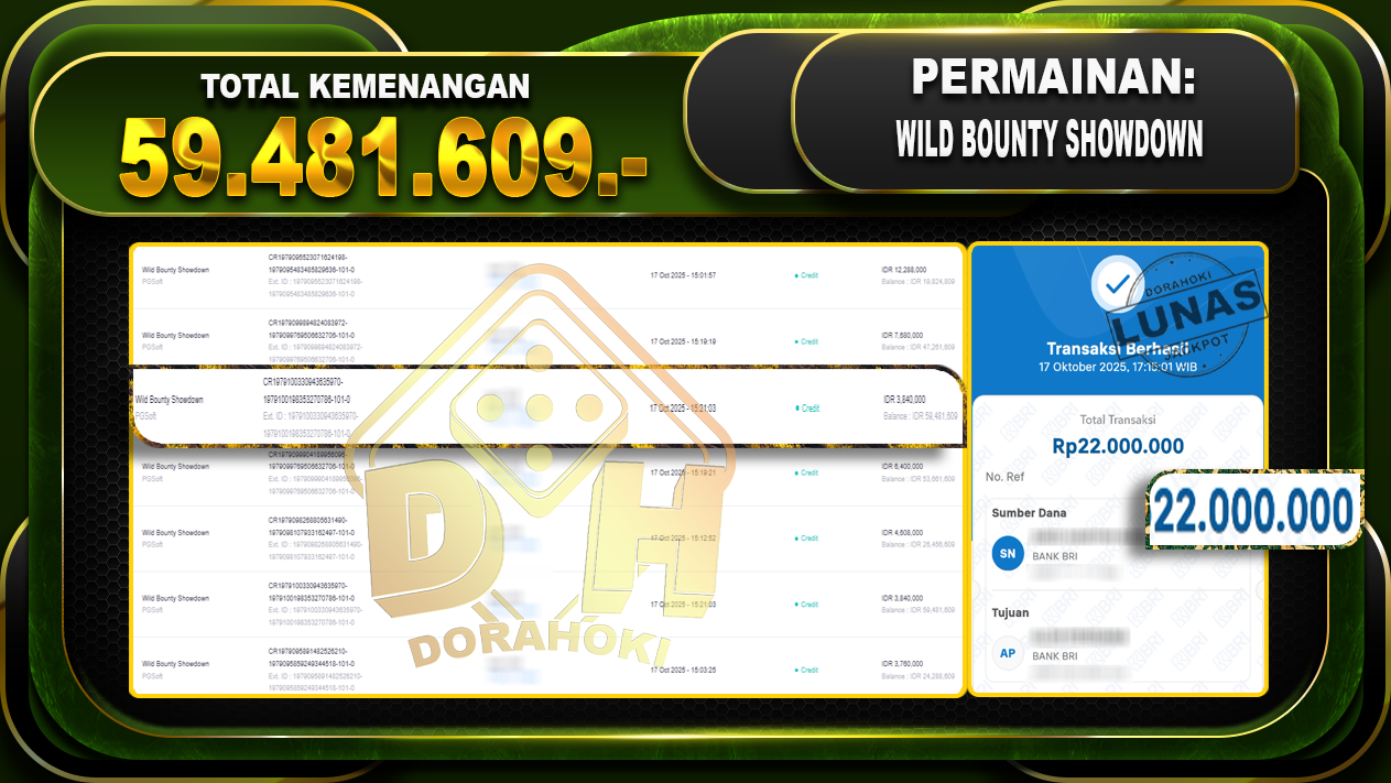 Bukti JP Wild Bounty Showdown – ucapkan selamat kepada user id setxxxxx atas kemenangan di Wild Bounty Showdown dengan total kemenangan Rp.59.481.609,- Yang pasti nya langsung LUNAS sesuai bukti ya bosku. Dorahoki nih bosku berapapun akan tetap kami bayar lunas ya bosku