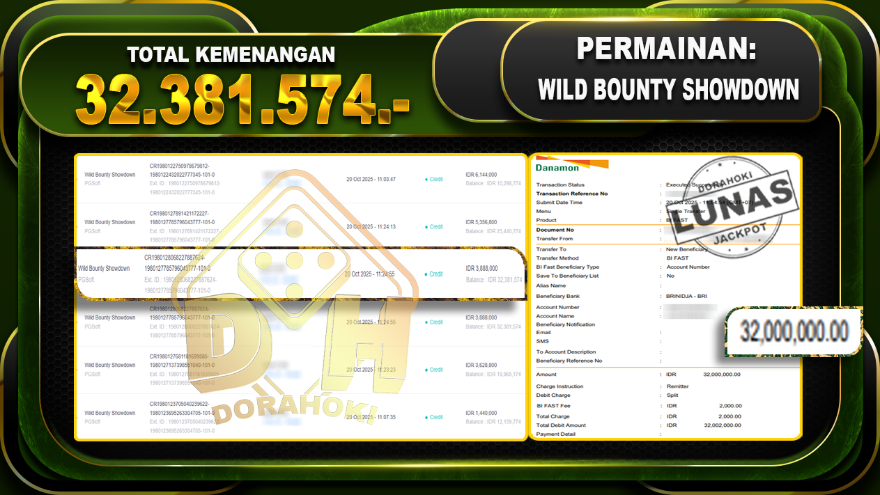 Bukti JP Wild Bounty Showdown – ucapkan selamat kepada user id setaxxxxxx atas kemenangan di  Wild Bounty Showdown dengan total kemenangan Rp.32.381.574,- Yang pasti nya langsung LUNAS sesuai bukti ya bosku. Dorahoki nih bosku berapapun akan tetap kami bayar lunas ya bosku