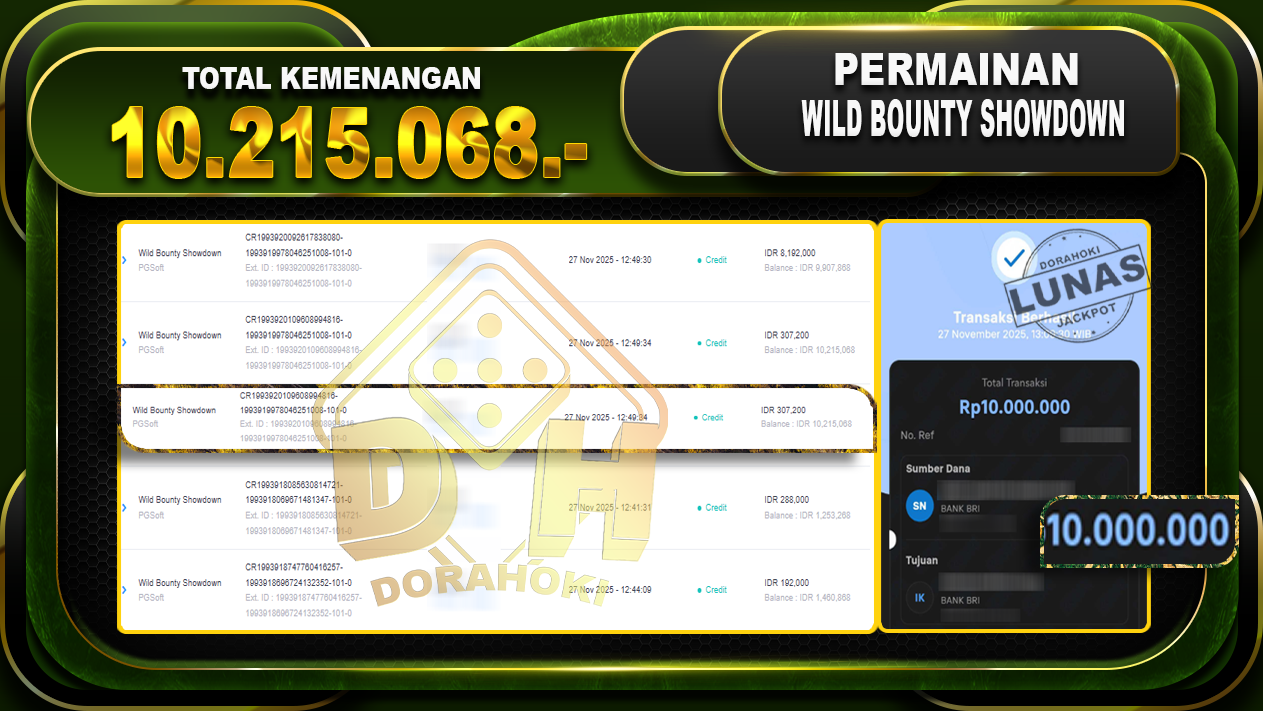 Bukti JP Wild Bounty Showdown – ucapkan selamat kepada user id sahxxxxx atas kemenangan di Wild Bounty Showdown dengan total kemenangan Rp.10.215.068,- Yang pasti nya langsung LUNAS sesuai bukti ya bosku. Dorahoki nih bosku berapapun akan tetap kami bayar lunas ya bosku