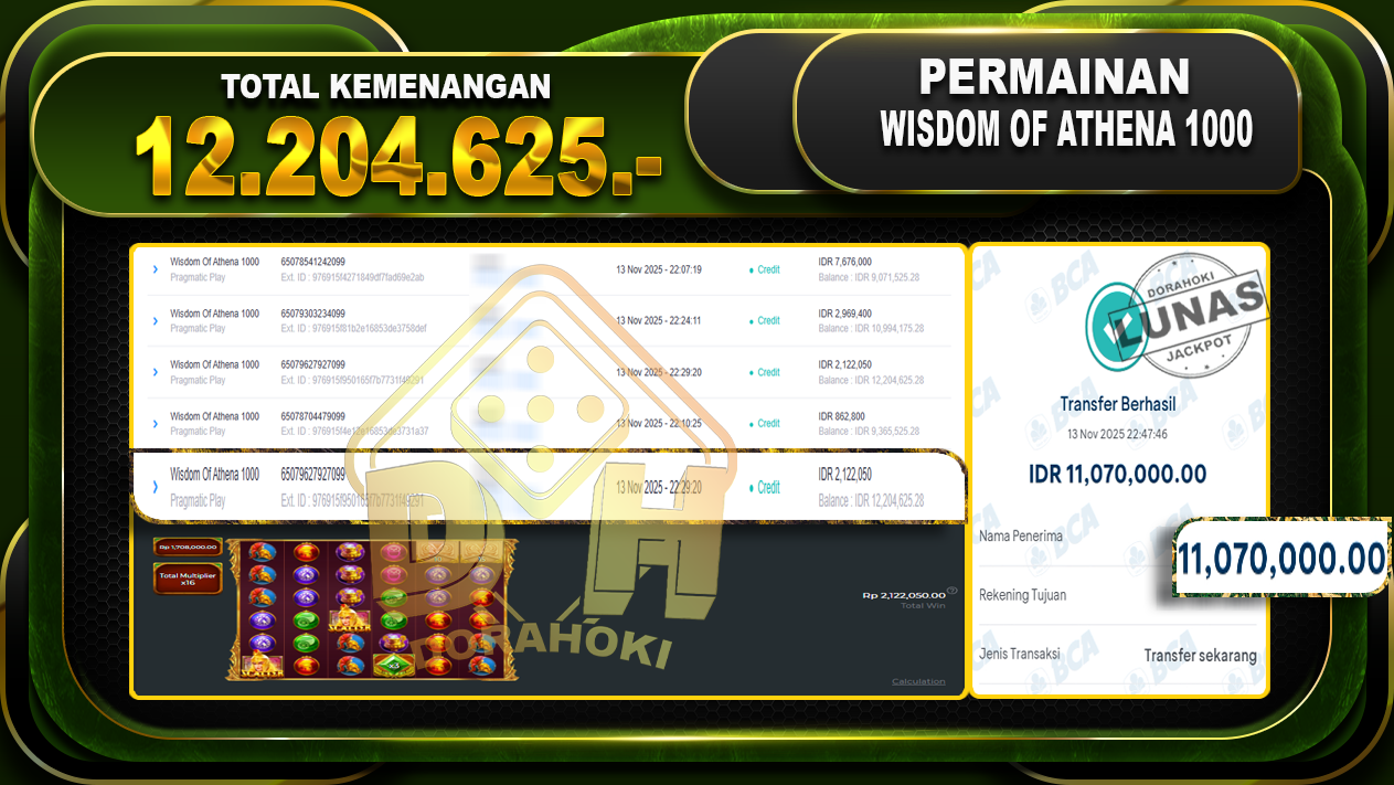 Bukti JP Wisdom Of Athena 1000 – ucapkan selamat kepada user id samxxx atas kemenangan di Wisdom Of Athena 1000 dengan total kemenangan Rp.12.204.625,- Yang pasti nya langsung LUNAS sesuai bukti ya bosku. Dorahoki nih bosku berapapun akan tetap kami bayar lunas ya bosku