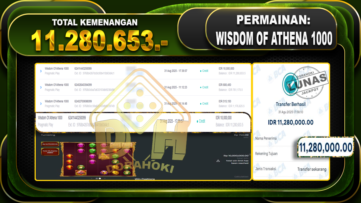 Bukti JP Wisdom Of Athena 1000 – ucapkan selamat kepada user id Senxxxx atas kemenangan di Wisdom Of Athena 1000 dengan total kemenangan Rp.11.280.653,- Yang pasti nya langsung LUNAS sesuai bukti ya bosku. Dorahoki nih bosku berapapun akan tetap kami bayar lunas ya bosku