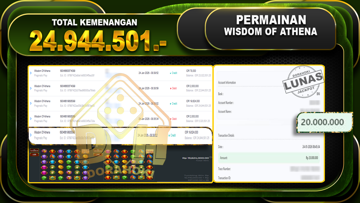 Bukti JP Wisdom Of Athena – Yang kami berikan ini sah dan real tanpa di rekayasa bosku dan hanya bertujuan untuk meningkatkan kepercayaan member kami dan memberikan kenyamanan saat bermain jadi bosku tidak perlu khawatir MENANG BERAPAPUN PASTI KAMI BAYAR LUNAS!!